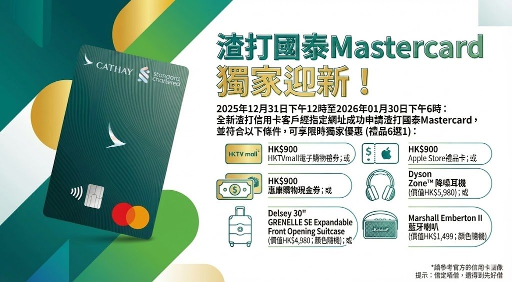即日至2026年02月27日下午6時:全新渣打信用卡客戶經指定網址成功申請渣打國泰Mastercard,符合條件可獲以下獨家獎賞(任選其一):